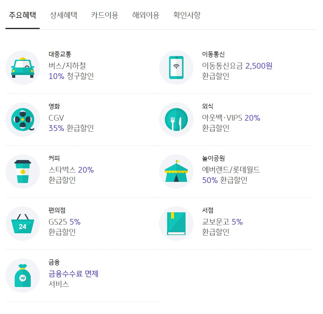 - 할인 제외 대상: 상품권 구매, 선불카드 충전, 백화점/대형마트 입점 매장 등