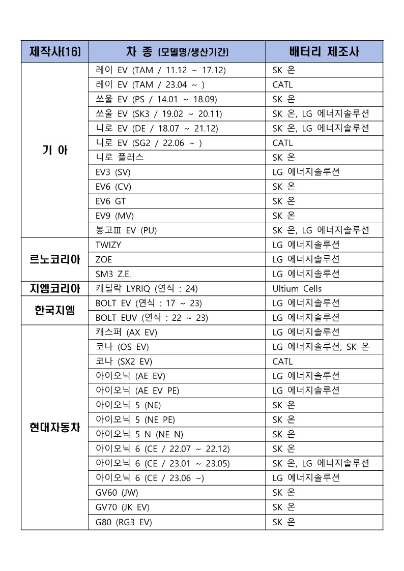 국토교통부는 소비자들이 전기차 배터리 제조사 정보를 쉽게 확인할 수 있도록 ‘자동차리콜센터 누리집’을 운영하고 있습니다. 이 누리집에서는 전기차 제작사별로 차종에 따른 배터리 제조사를 확인할 수 있으며, 배터리 관련 정보가 실시간으로 업데이트됩니다.
