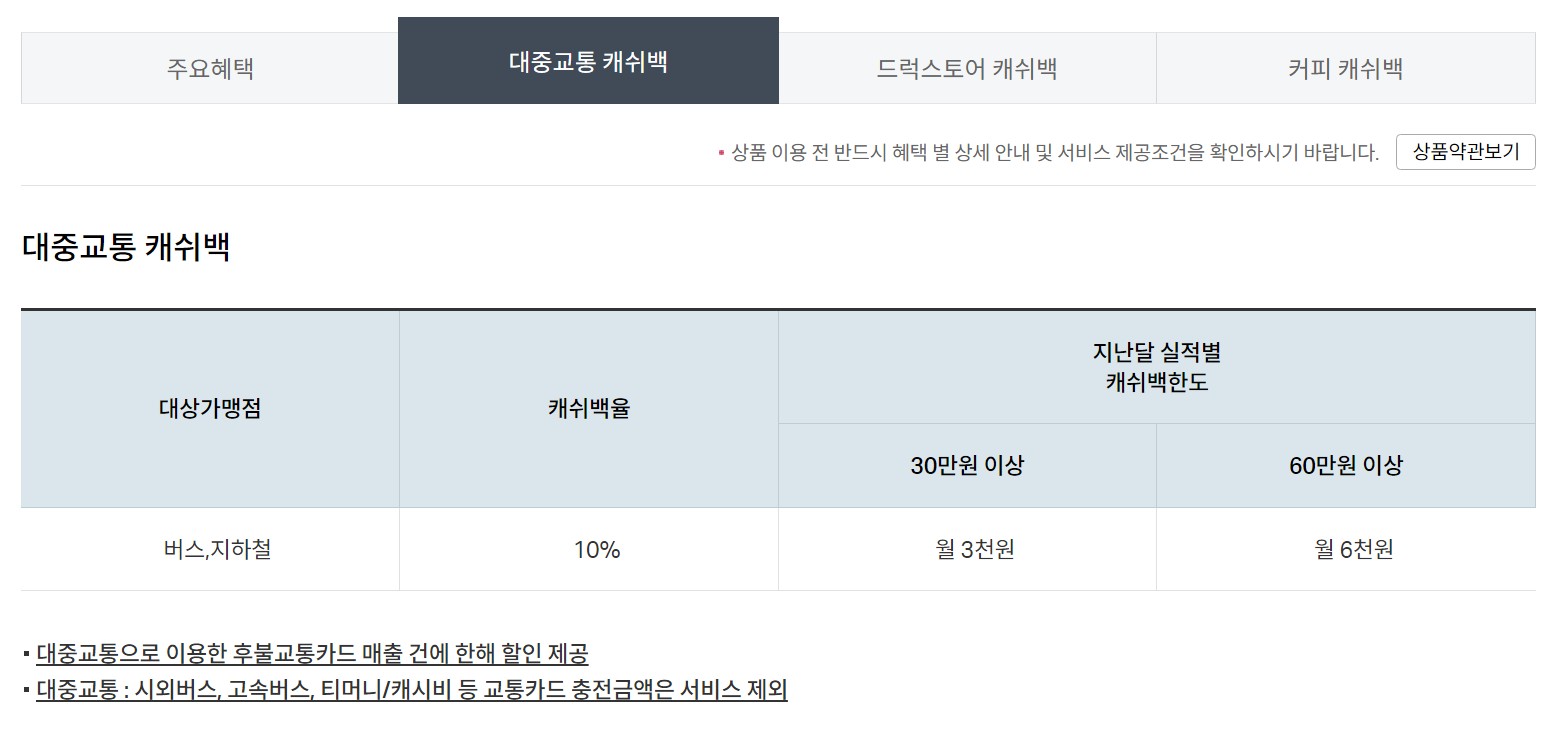 - 대중교통으로 이용한 후불교통카드 매출 건에 한해 할인 제공