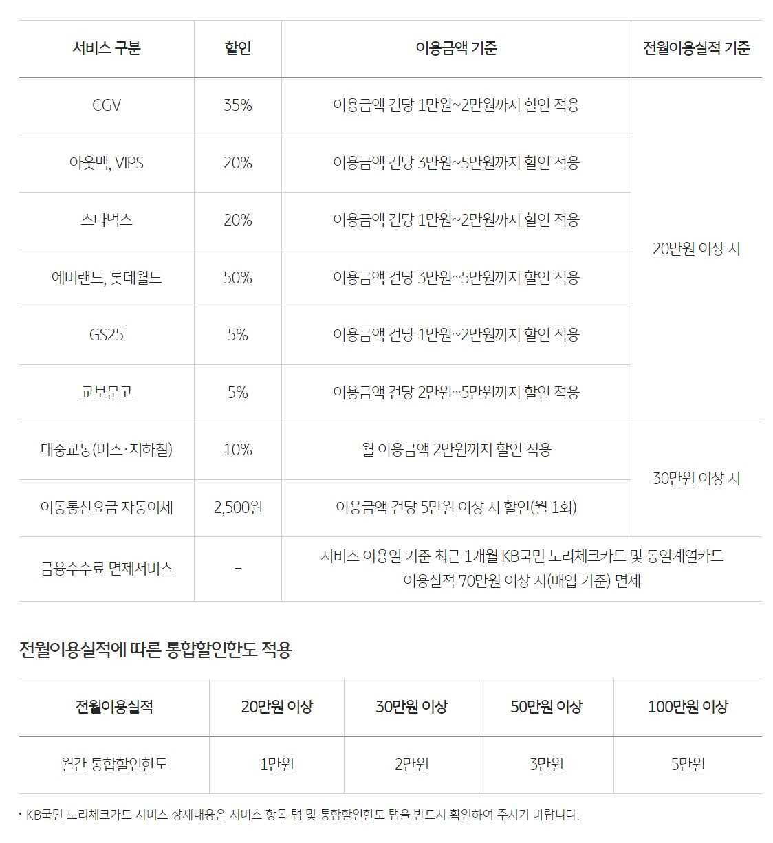 - 전월 1일~말일까지 "KB국민 노리체크카드"로 이용한 승인금액(이용일 기준)으로 산정, 교통 및 해외이용금액은 제외