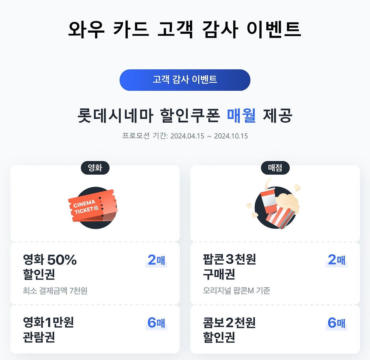 쿠팡와우카드는 롯데시네마 할인쿠폰 제공, 쿠팡캐시 프로모션 적립 기간 연장 등 다양한 부가 혜택도 제공합니다. 이는 소비자들에게 추가적인 혜택을 제공하여 더욱 많은 혜택을 누릴 수 있도록 도와줍니다.