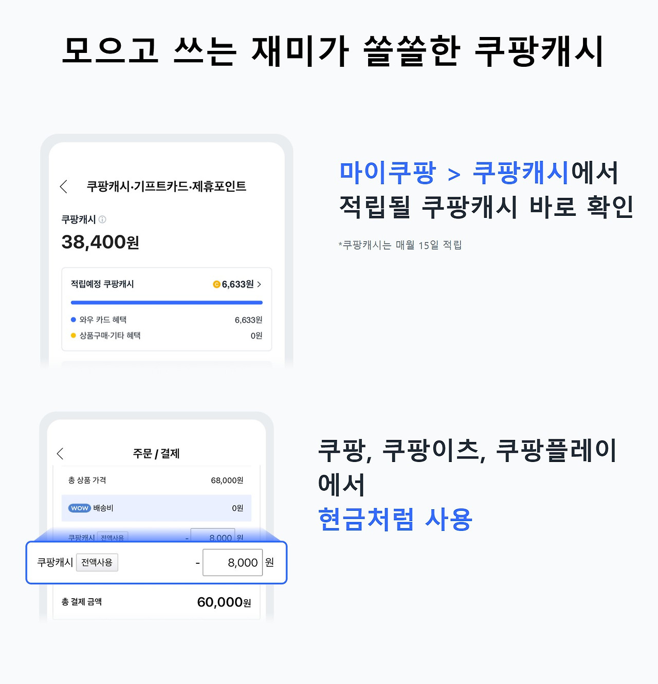 매월 15일에 적립된 쿠팡캐시는 쿠팡, 쿠팡이츠, 쿠팡플레이에서 현금처럼 사용할 수 있습니다. 이로 인해 적립된 캐시를 실제 구매 시 유용하게 활용할 수 있습니다.