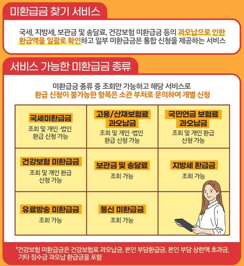 국세, 지방세, 보관금 및 송달료, 건강보험 미환급금 등의 과오납으로 인한 환급액을 일괄로 확인하고 일부 미환급금은 통합 신청을 제공하는 서비스