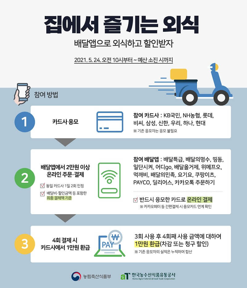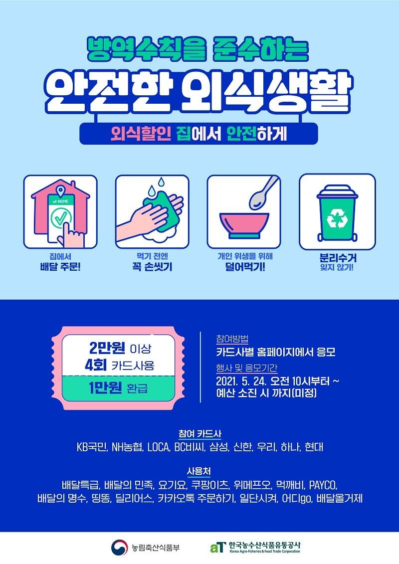 5월 24일부터 농림축산식품부가 코로나19 극복을 위해 비대면 외식비용을 지원한다고 합니다.