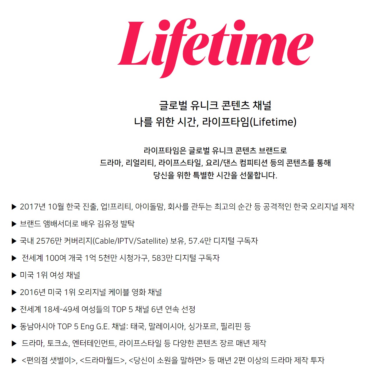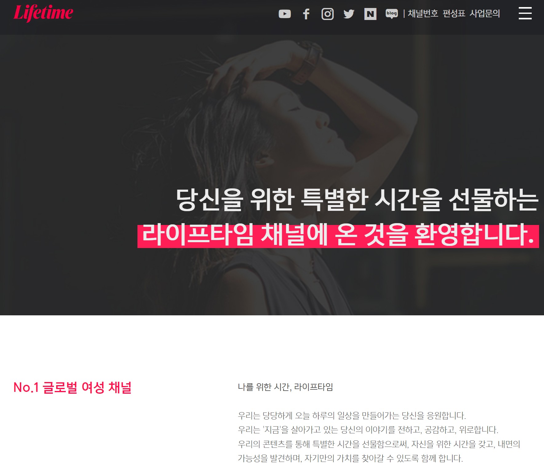 라이프타임 채널은 다양한 플랫폼에서 시청할 수 있는 글로벌 리딩 여성 콘텐츠 브랜드입니다. IPTV, 케이블 TV, 위성방송, OTT 서비스 등 여러 방법으로 라이프타임 채널을 즐길 수 있으며, 각 서비스의 채널 번호를 확인하여 편리하게 시청하시기 바랍니다. 라이프타임 채널의 다양한 프로그램과 유튜브 콘텐츠, 브랜딩 캠페인을 통해 더욱 풍성한 시간을 보내세요. "나를 위한 시간, 라이프타임"이라는 슬로건처럼, 라이프타임 채널은 언제나 여러분의 곁에서 즐거움과 감동을 전해드릴 것입니다.