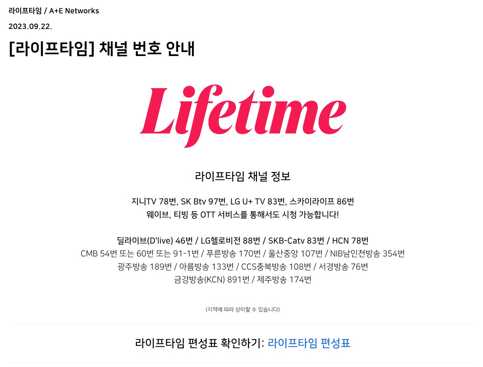 라이프타임 채널: 편성표와 시청 방법 안내