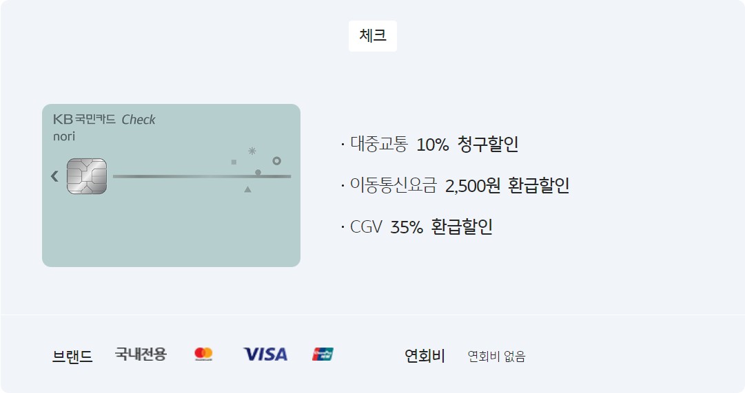 KB국민카드에서 제공하는 노리 체크카드는 다양한 생활 혜택을 제공하는 카드로, 대중교통, 이동통신요금, 영화, 푸드, 테마파크, 금융 수수료 면제 등 다양한 영역에서 할인 혜택을 받을 수 있습니다. 전월 실적 20만원 이상을 충족하면 다양한 혜택을 누릴 수 있으며, 국내외 겸용으로 사용 가능합니다. 이번 글에서는 노리 체크카드의 주요 혜택과 유의사항에 대해 자세히 알아보겠습니다.