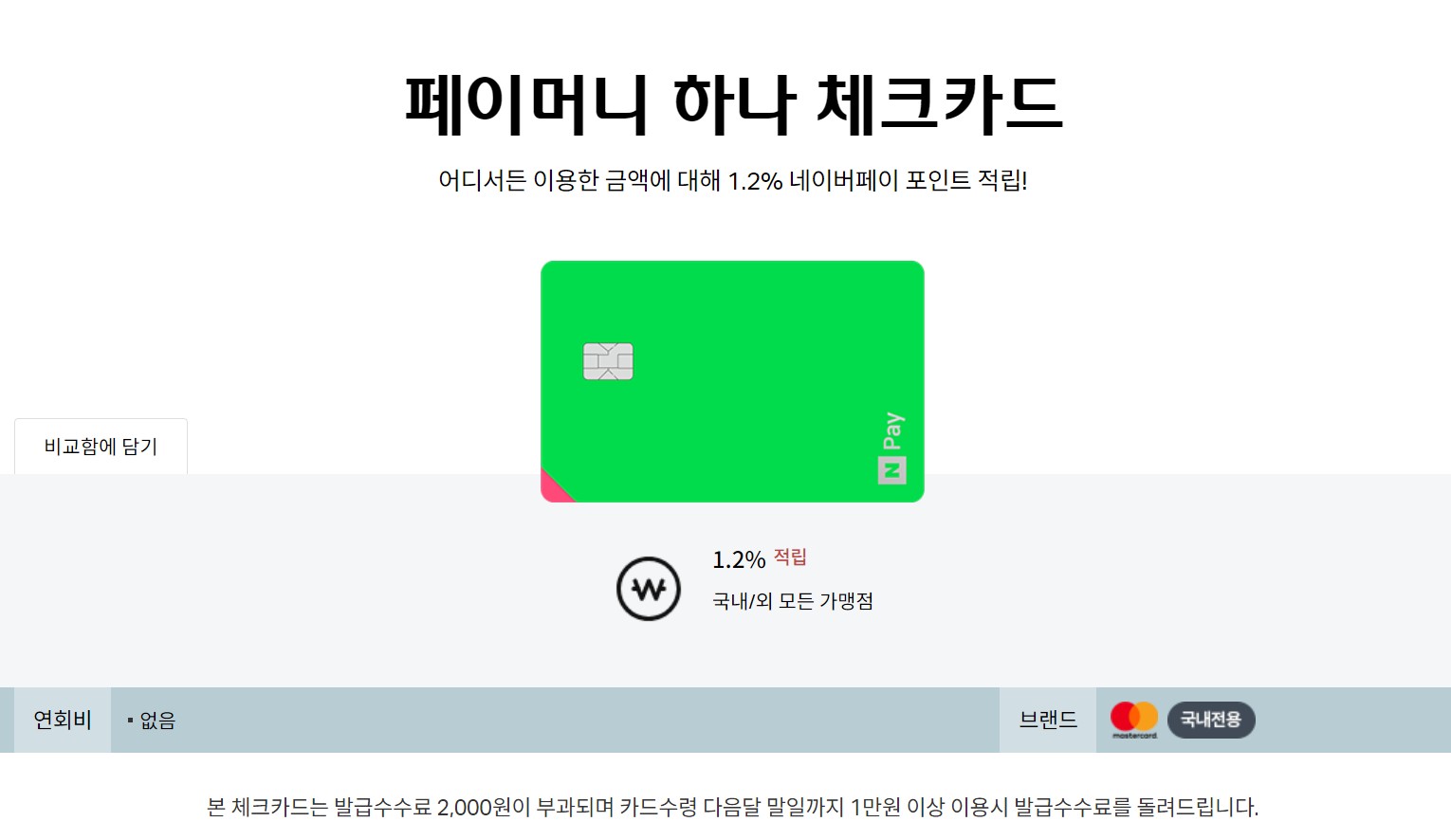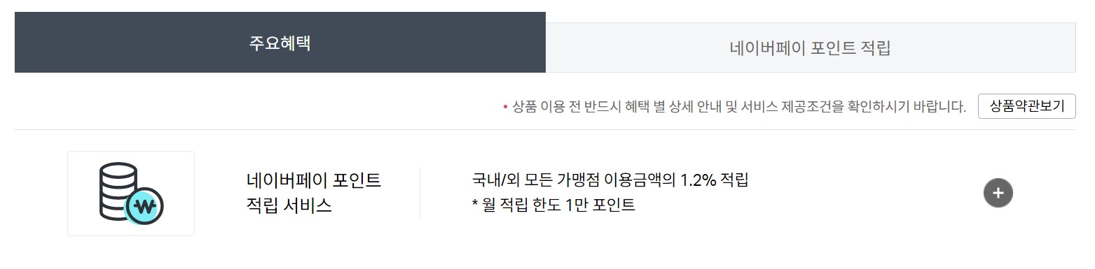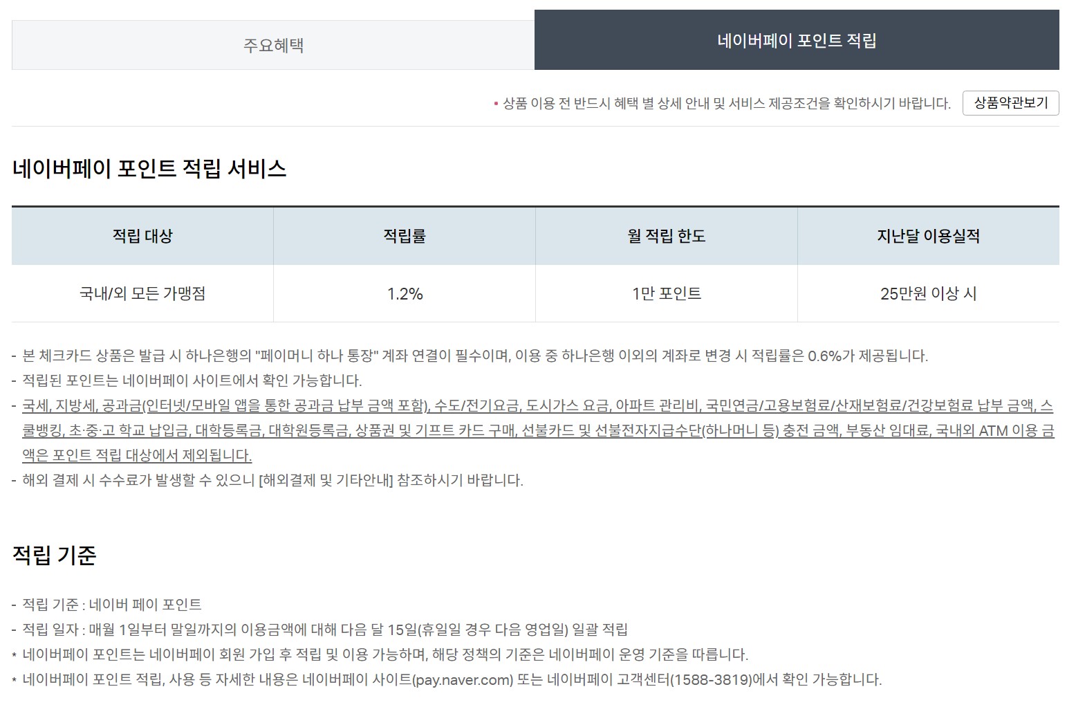 - 본 체크카드 상품은 발급 시 하나은행의 '네이버페이 머니 하나 통장' 계좌 연결이 필수이며, 이용 중 하나은행 이외의 계좌로 변경 시 적립률은 0.6%로 제공