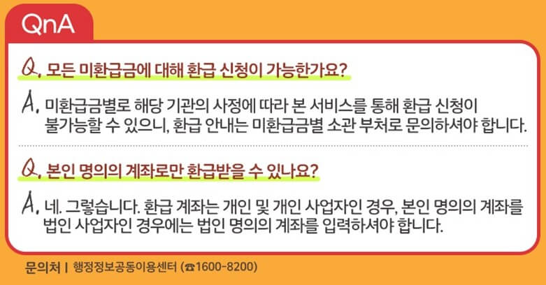 A. 미환급금별로 해당 기관의 사정에 따라 본 서비스를 통해 환급 신청이 불가능할 수 있으니, 환급 안내는 미환급금별 소관 부처로 문의하셔야 합니다