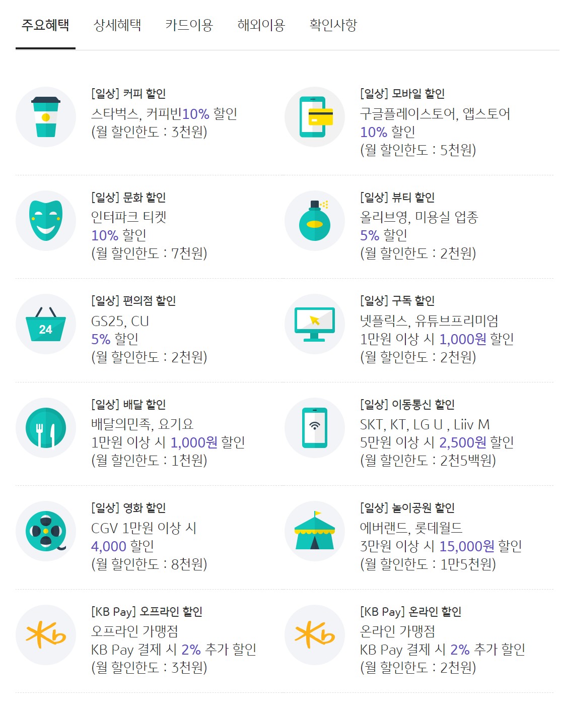 - 특정 가맹점 혜택 적용: 각 혜택은 지정된 가맹점에서만 적용됩니다.